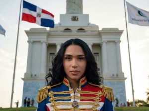 En esta pieza, Steffany Constanza asume un rol que refleja la majestad de nuestra cultura. Ataviada con un traje de gala de corte militar, encarna la dignidad y el respeto frente a monumentos históricos como el Altar de la Patria y la Zona Colonial, reafirmando la soberanía de nuestro legado.