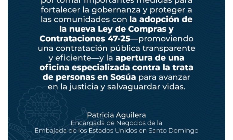 “Felicitaciones al Gobierno dominicano por tomar importantes medidas para fortalecer la gobernanza y proteger a las comunidades con la adopción de la nueva Ley de Compras y Contrataciones, 47-25, promoviendo una contratación pública, transparente y eficiente, y la apertura de una oficina especializada contra la trata de personas en Sosúa, para avanzar en la justicia y salvaguardar vidas”, expresó Aguilera, en la red social de Instagram de la Embajada de Estados Unidos en la República Dominicana.